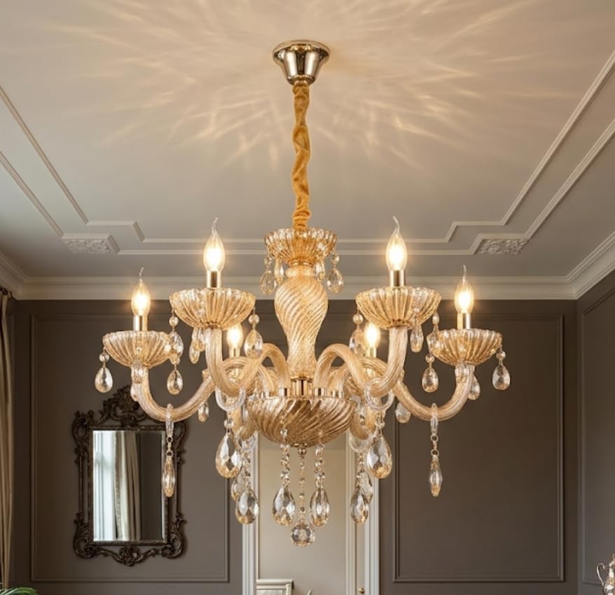 10-light glass candle chandelier designed to blend antique charm with modern elegance for a luxurious interior . The candle-style arms paired with sleek crystal glass detailing create a warm, balanced glow that enhances any living or dining space.