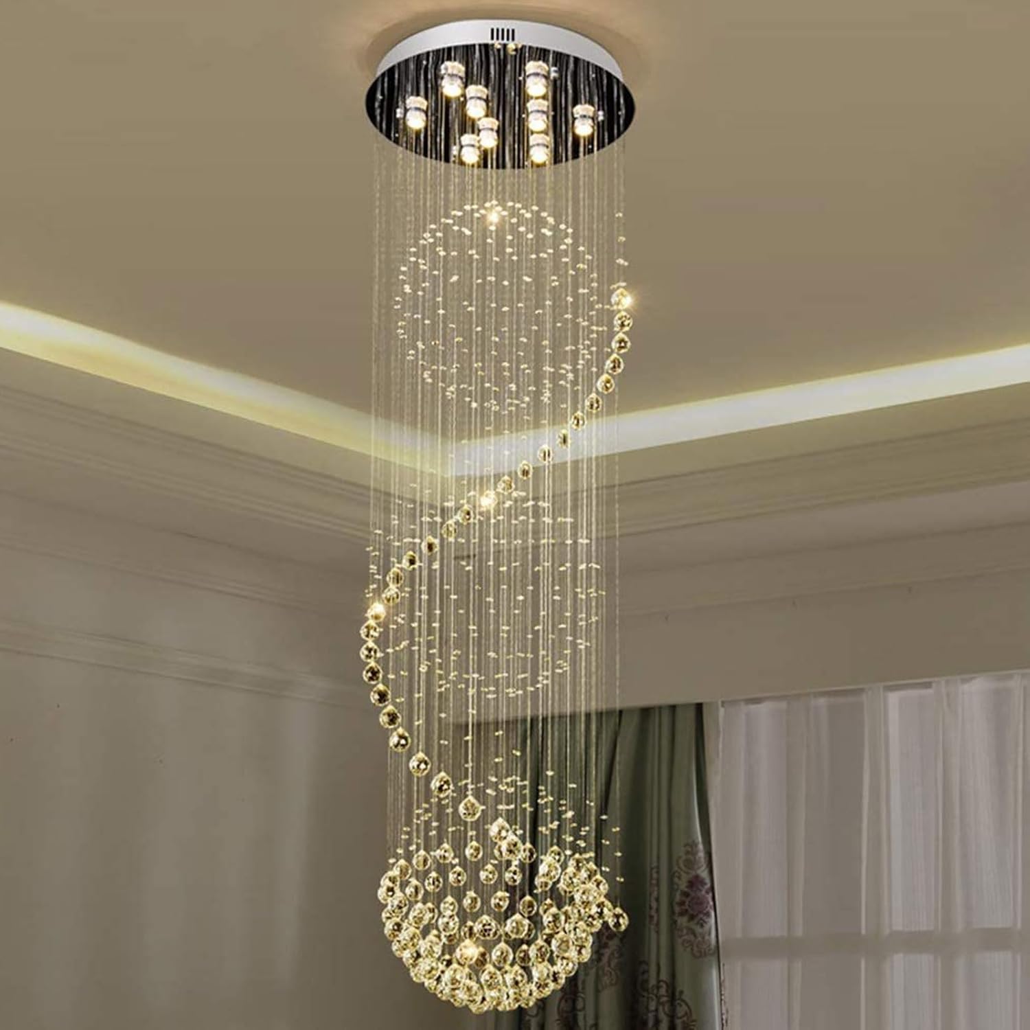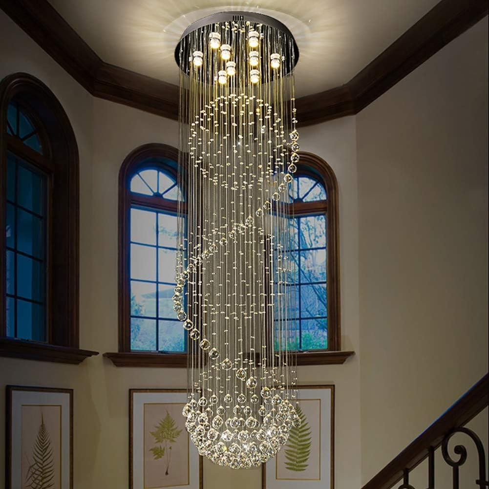 Luxury raindrop crystal chandelier designed to create a dramatic visual statement with cascading K9 crystal spheres arranged in a stunning spiral formation.